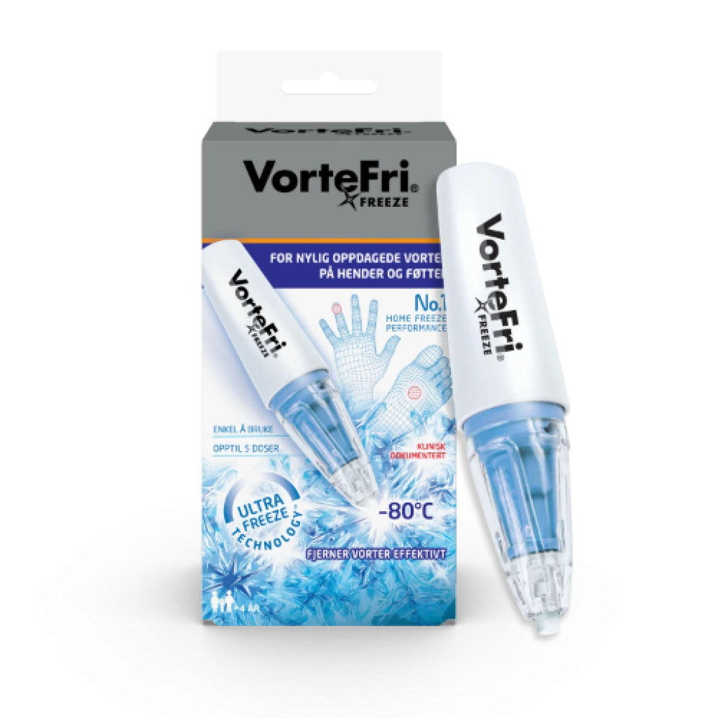 VorteFri® FREEZE er en rask hjemmebehandling som effektivt fjerner nylig oppdagede vorter på hender, armer og føtter. Dette er den første hjemmebehandling med dinitrogenoksid, en svært kald gass. Ved hjelp av en Ultra Freeze Technology™ fryses vorten ved -80 °C og de dypeste lagene i vorten nås.