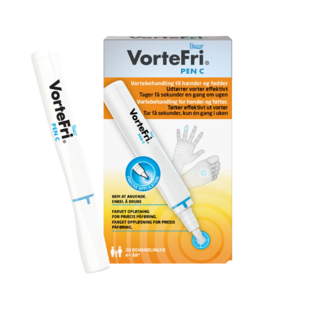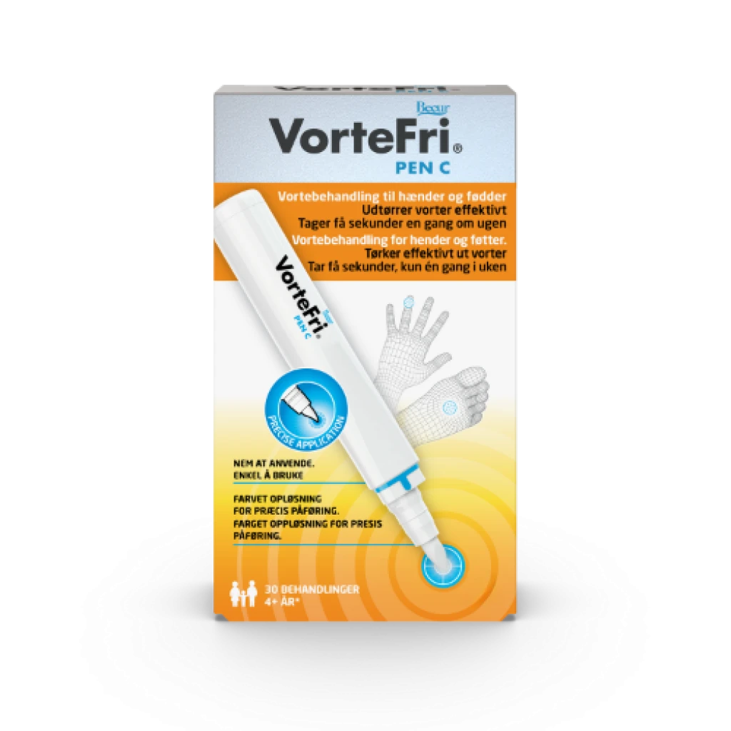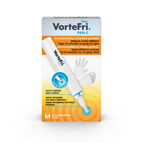 3 mlVorteFri® PEN C er en moderne og effektiv metode for behandling av vorter med en farget væske, som kan påføres på få sekunder. Oppløsningen kan brukes av hele familien for å fjerne vorter på hender, føtter, albuer og knær.